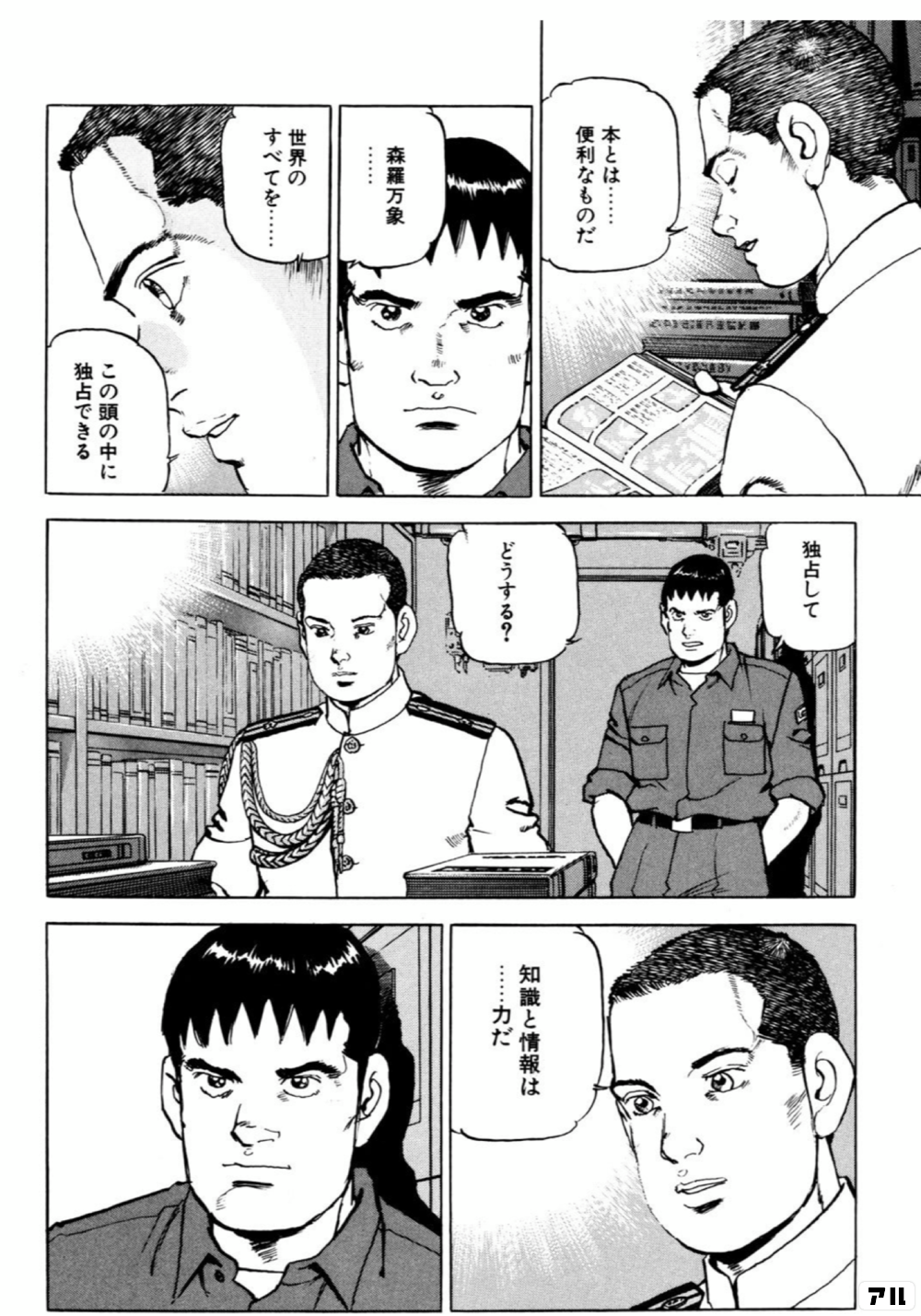 本とは 便利なものだ 森羅万象 世界のすべてを この頭の中に独占できる 独占して どうする 知恵と情報は 力だ ジパング アル